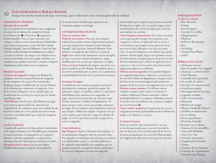 Este es un mazo con 77 cartas de biblioteca y 12 cartas de cripta, listo para jugar directamente o personalizar con otras cartas de Vampire: The Eternal Struggle. Cada jugador necesita un mazo para jugar.