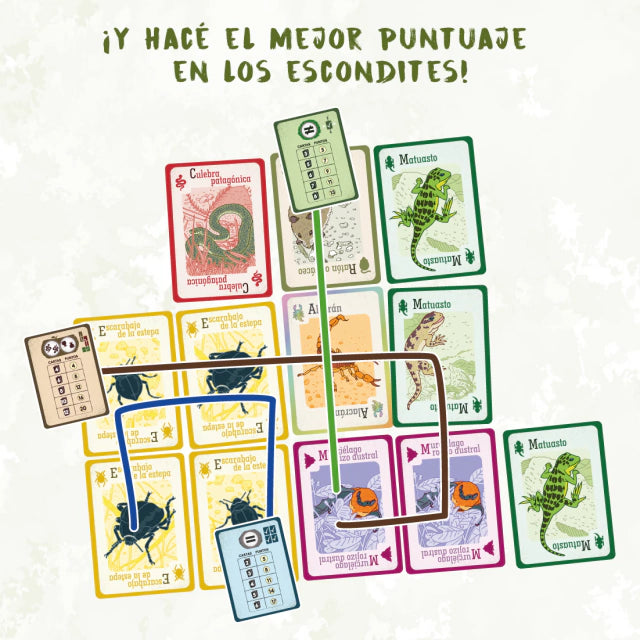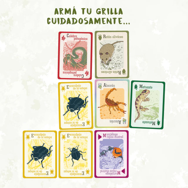 Bicharracos es un juego de cartas competitivo en el que los jugadores deben ayudar a las especies patagónicas a esconderse de los campistas que llegan a su hábitat. A través de la formación de una cuadrícula personal y la colocación estratégica de cartas, cada jugador buscará obtener la mejor puntuación al final de la partida.