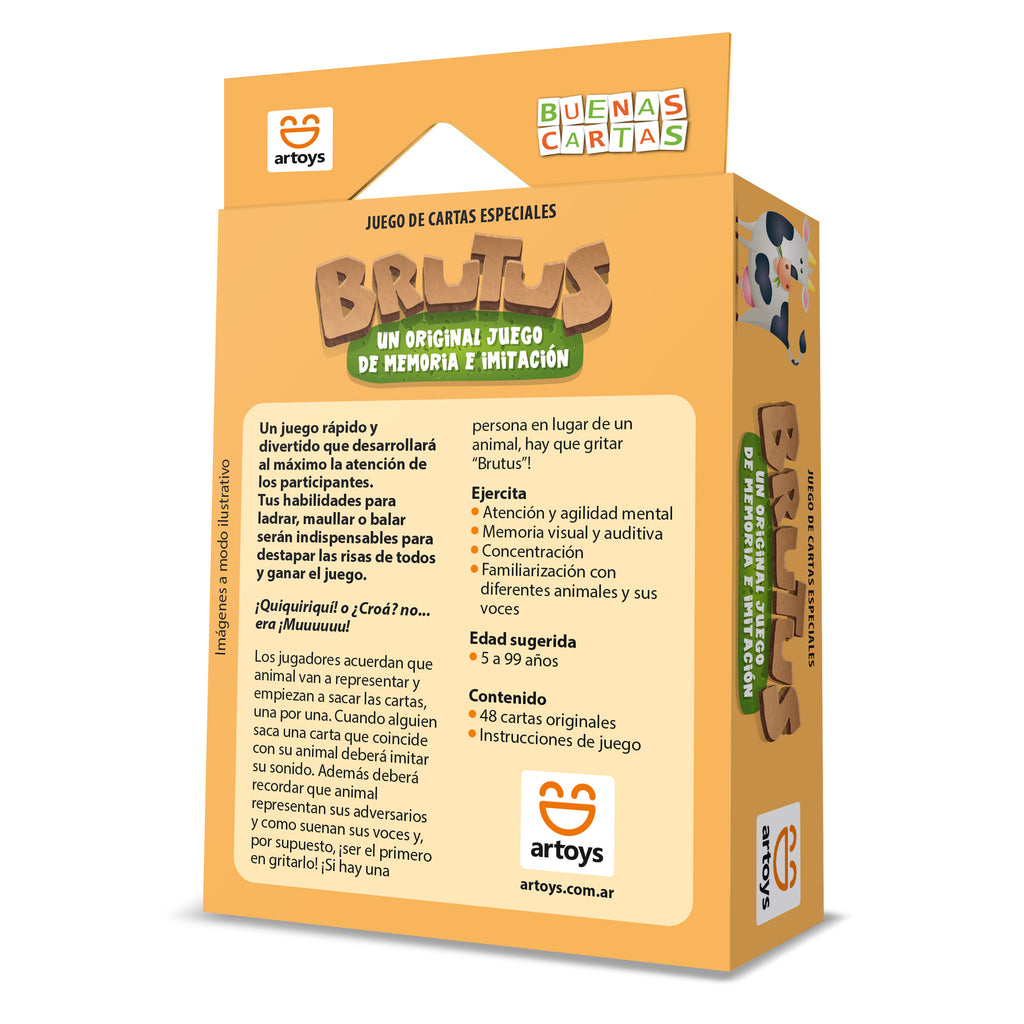Brutus es un juego de cartas rápido y divertido que desafía la atención y la memoria de los participantes. Los jugadores acuerdan representar un animal y, al sacar cartas, deben imitar su sonido cuando aparece su animal. Si aparece una carta con una persona en lugar de un animal, ¡hay que gritar “Brutus”!