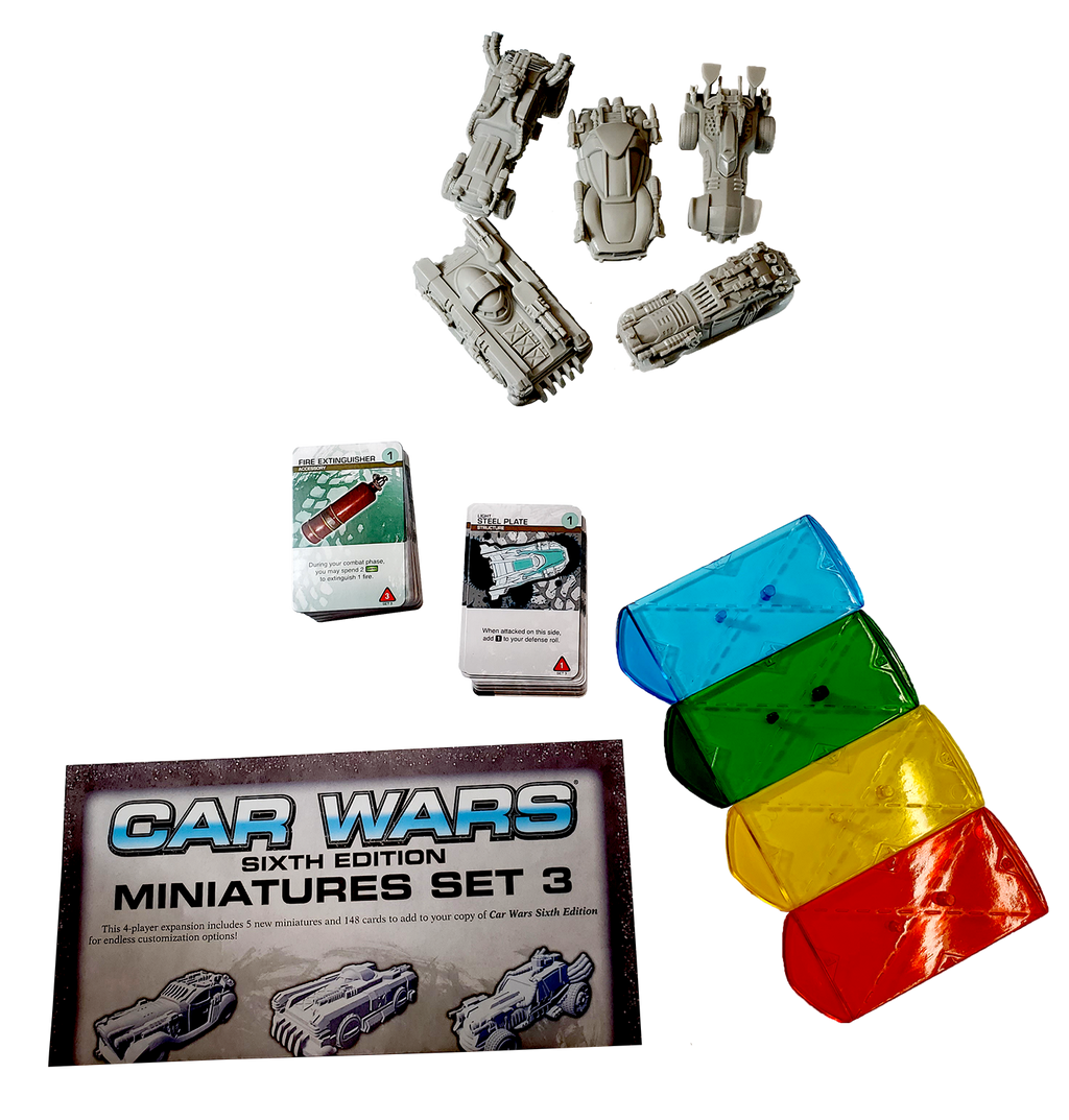 El Miniatures Set 3 es una expansión para Car Wars Sixth Edition que introduce cinco nuevos vehículos, cada uno con diseños únicos y capacidades distintas. Este set amplía las opciones estratégicas y estéticas del juego, permitiendo a los jugadores personalizar aún más sus partidas.