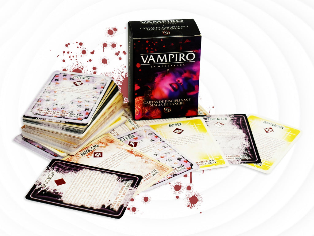 Esta baraja de cartas es una referencia rápida y una forma sencilla de mantener el rastro a Disciplinas, Poderes y rituales de Hechicería de Sangre y Alquimia de Sangre de tus partidas de Vampiro: La Mascarada, con 80 cartas que hacen referencia a las Disciplinas y 41 cartas que incluyen todos los Poderes y rituales de Hechicería de Sangre y todos los Poderes de Alquimia de Sangre Débil, estas cartas harán que tus partidas fluyan sin problemas.