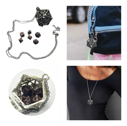 Colgante: Jaula D20 con Set Dados Mini Plateado