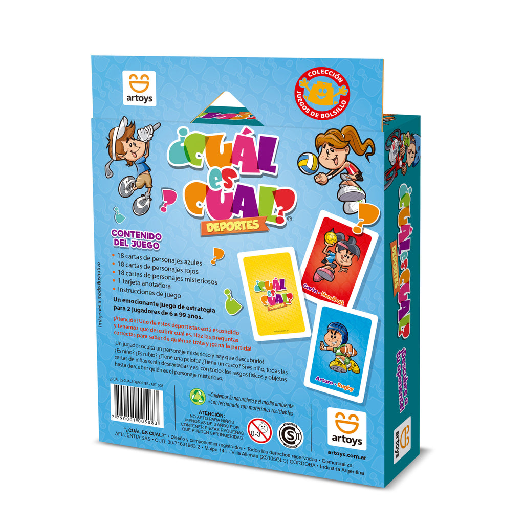 En ¿Cuál es Cual? Deportes, dos jugadores se enfrentan para descubrir qué personaje deportivo ha elegido el oponente, formulando preguntas de sí/no sobre rasgos físicos u objetos (“¿Es niño?”, “¿Lleva casco?”, “Tiene pelota?”) y descartando cartas hasta dar con la respuesta correcta.