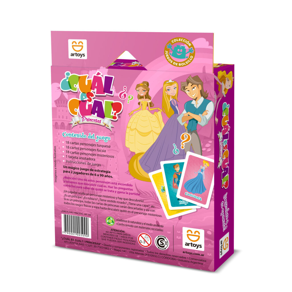 En ¿Cuál es Cual? Princesas, dos jugadores se enfrentan para adivinar qué personaje real o de cuento de princesas ha seleccionado el oponente. Mediante preguntas de sí/no sobre rasgos característicos (“¿Lleva tiara?”, “¿Su vestido es azul?”, “¿Es de un cuento clásico?”), irás descartando opciones hasta dar con la respuesta correcta.