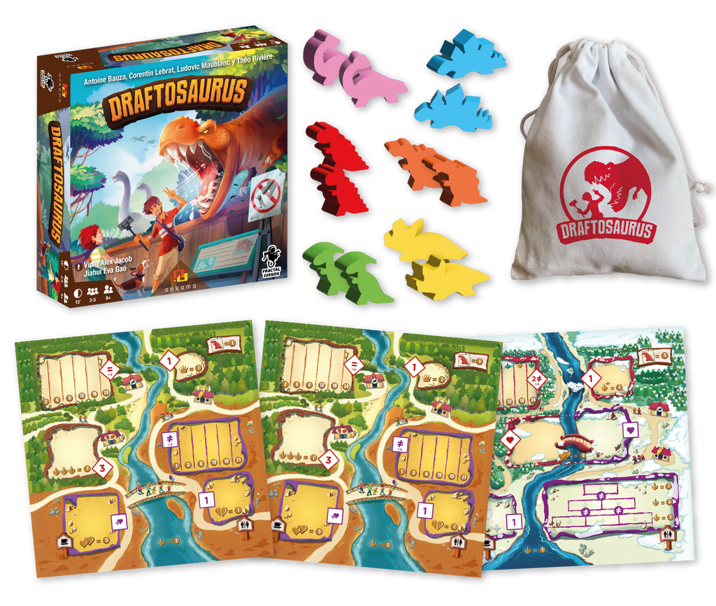 En Draftosaurus, los jugadores asumen el rol de administradores de un parque de dinosaurios. Tu tarea: poblar tus recintos con las criaturas más impresionantes, buscando combinaciones que te otorguen la mayor cantidad de puntos. El giro está en la mecánica de draft: cada turno deberás elegir un dinosaurio de los que tienes en mano… ¡y pasar el resto a tu oponente!