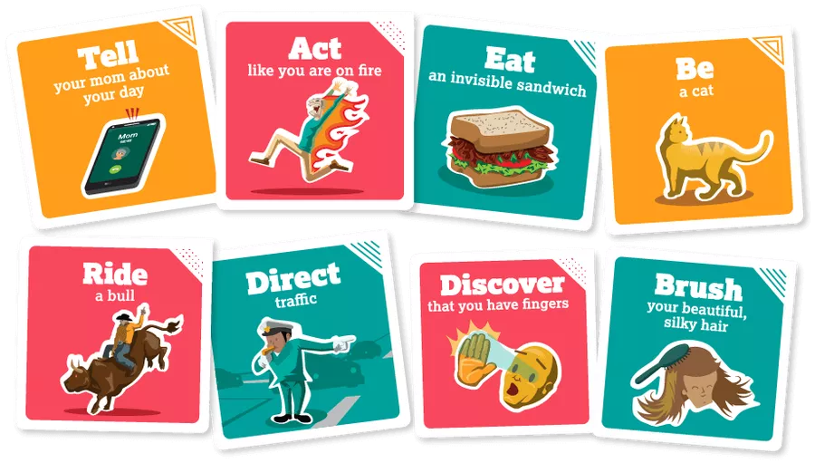 Cada jugador recibe una carta de acción que indica algo divertido para interpretar, como "cantar ópera" o "hacer yoga". Junto a esto, una carta de intensidad secreta indica cuán enérgicamente debe realizarse la acción (en una escala de 1 a T-Rex). -