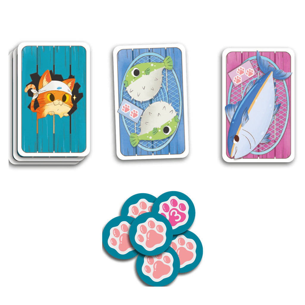 60 cartas de pez + 4 cartas de expansión (calamares), con ilustraciones de estilo asiático a cargo del artista Hami