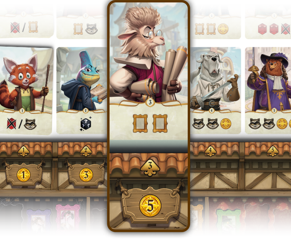 For a Crown es un juego de construcción de mazos y tomas de decisiones bajo presión, ambientado en un reino donde familias rivales compiten por el poder. En cada partida de 30–45 minutos, de 3 a 5 jugadores (solo o con amigos), reclutas mercenarios, usas poderes especiales y te abrochas para ganar la mayor cantidad de rubíes. Al final de cuatro rondas, quien tenga más joyas se convierte en el rey