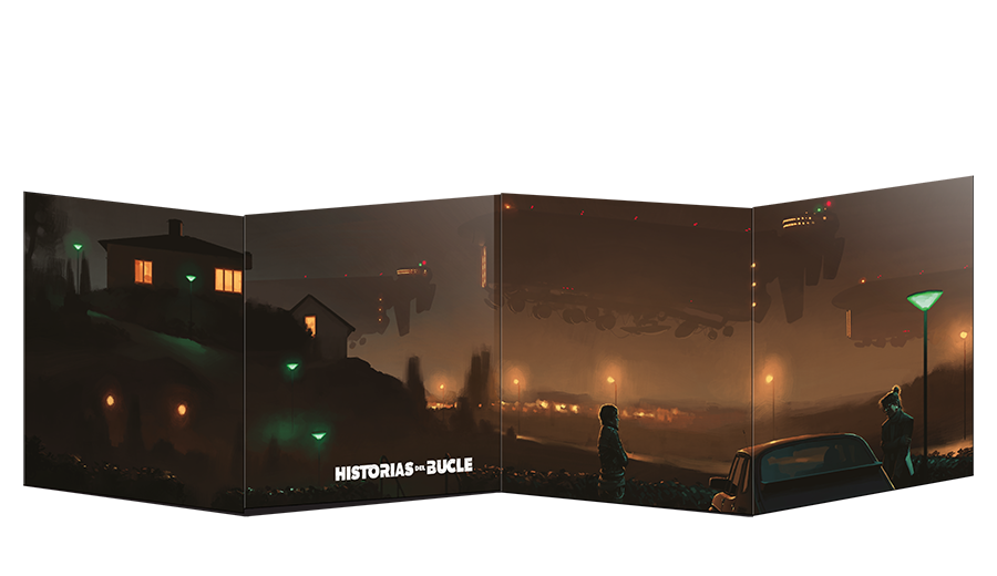 - Pantalla de 4 paneles con arte evocador de Historias del Bucle