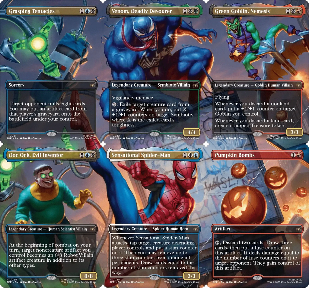 Las 6 cartas exclusivas forman una escena continua sacada directamente de las aventuras de Spidey. Ya sea que las uses en tu mazo o las exhibas con orgullo, esta caja es una joya de colección.