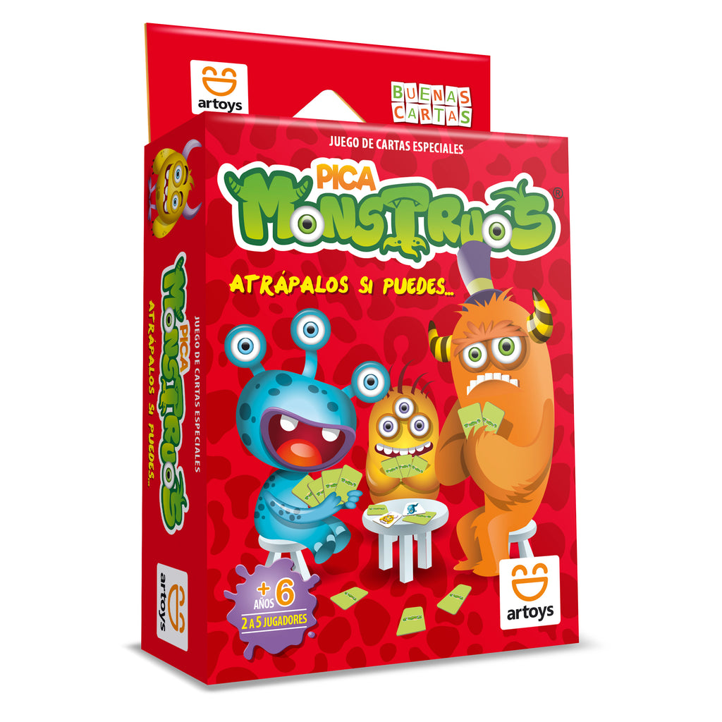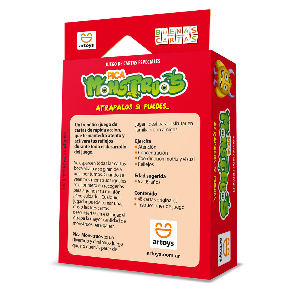 Pica Monstruos es un juego de cartas de acción rápida que desafía tus reflejos y atención. Durante el juego, las cartas se colocan boca abajo y se revelan una a una. Cuando aparecen tres monstruos iguales, debes ser el primero en atraparlos para sumar puntos. ¡Pero cuidado! Cualquier jugador puede tomar una, dos o las tres cartas descubiertas en esa jugada. El objetivo es atrapar la mayor cantidad de monstruos para ganar.