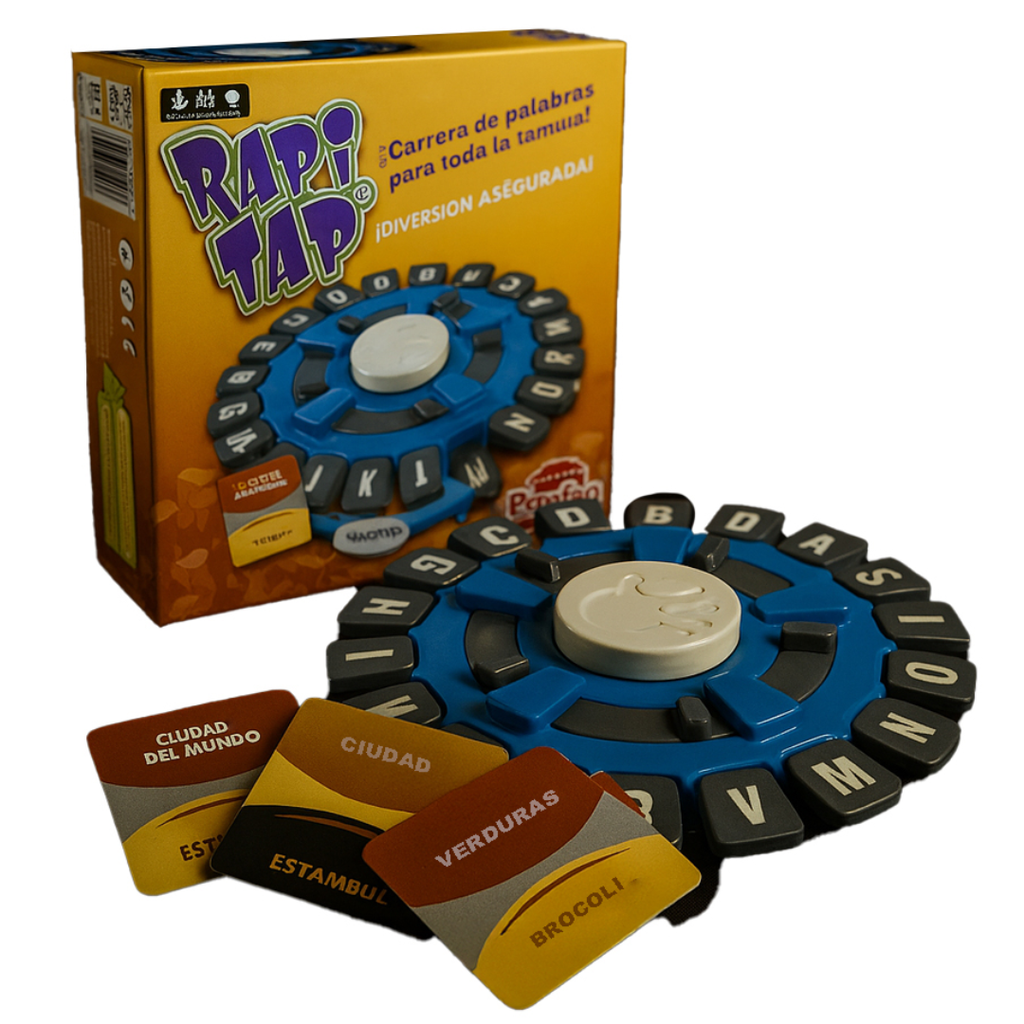 - 📦 Contenido: Cartas con categorías, tablero giratorio con letras y temporizador.