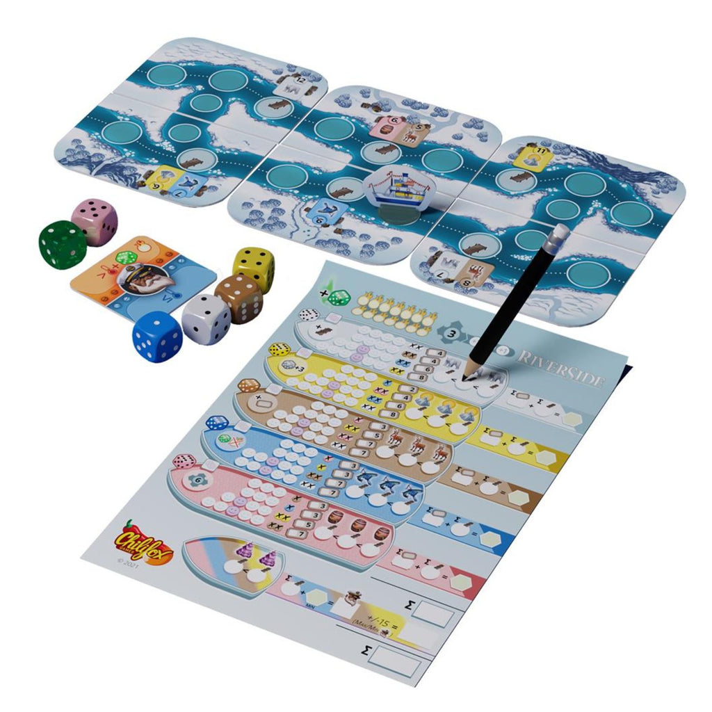 Riverside combina la mecánica clásica del roll-and-write con elementos innovadores que lo hacen destacar:
