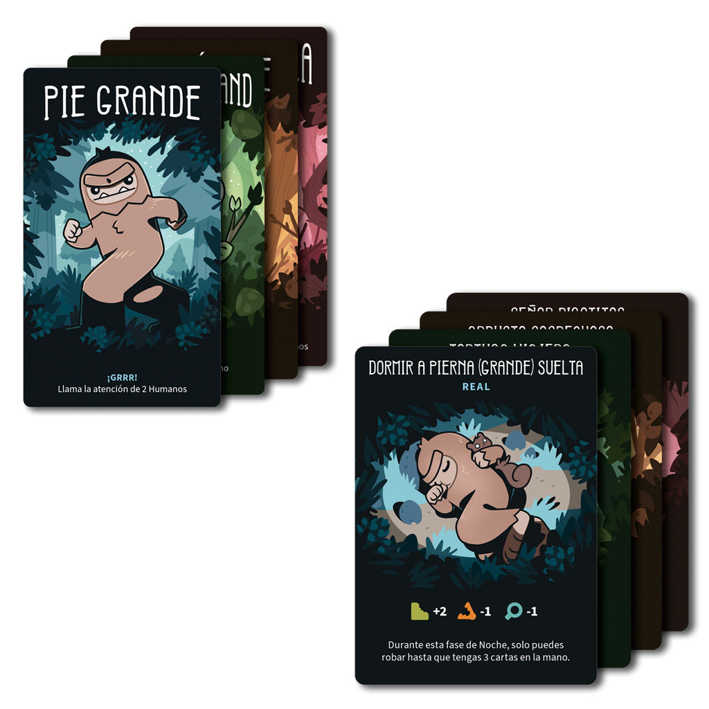 Las cartas y componentes están repletos de ilustraciones vibrantes inspiradas en criaturas míticas como Pie Grande, el Chupacabras y otras leyendas urbanas. El tablero recrea un entorno natural donde acechan humanos curiosos y sombras misteriosas.