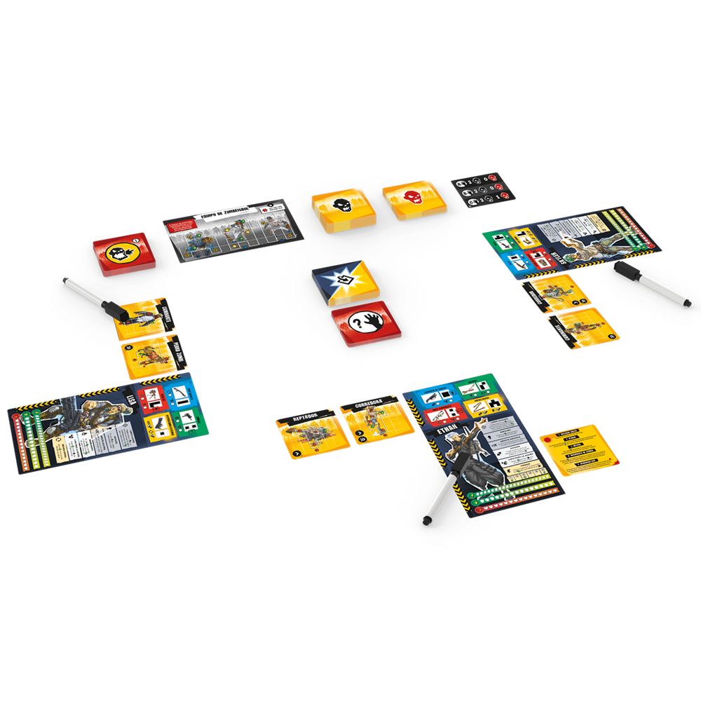 Contenido: tablero de jugador y jefe con marcadores borrables, tarjetas de turno y de aparición, reglas e indicadores para seguimiento de armas y zombis